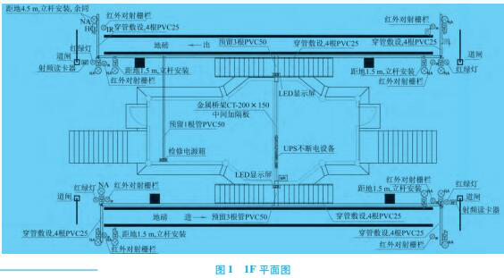 每個地磅的出口端距離邊緣約0. 5 m處,各 設置1套射頻讀卡器(立桿安裝),桿高為1.5 m。磅房所有射頻讀卡器所需電源均引自UPS機柜。 3.2.4智能稱重管控系統(tǒng)