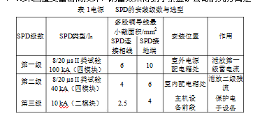 由于雷電沖擊波的主要能量集中在從工頻附近幾十赫茲到幾百赫茲的低端,所以,雷電沖擊波能量很容易與工頻回路發(fā)生耦合、諧振。雷電沖擊波從電源線路進(jìn)入電子設(shè)備的概率比從信號(hào)線中進(jìn)入的概率要高得多。據(jù)統(tǒng)計(jì),約有80%的電子設(shè)備雷擊損壞事故是由電源線路引入閃電電涌造成的,因此,應(yīng)特別加強(qiáng)系統(tǒng)中設(shè)備電源的防雷措施。在選型時(shí),要選擇殘壓小、響應(yīng)時(shí)間快的SPD。電源 SPD的選擇、安裝情況如表1所示。