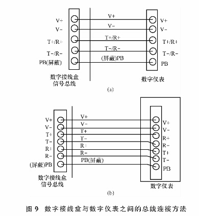 數(shù)字接線盒連接數(shù)字儀表是通過(guò)一條信號(hào)總線連接。 接線原則要根據(jù)數(shù)字傳感器的線制來(lái)決定。 四線制數(shù)字接線盒與儀表按 “ 同名端連接 ” 原則進(jìn)行連接。 六線制數(shù)字接線盒與儀表是按照“電源同名端連接”, “信號(hào)線發(fā)送連接接收 , 正對(duì)正, 負(fù)對(duì)負(fù) ” 的原則接線。  如圖 9(a)、 (b)所示, 分別是四線制和六線制數(shù)字接線盒與數(shù)字儀表的總線連接方法示意。