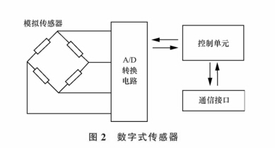 數(shù)字式傳感器的概念是與輸出模擬信號(hào)的模擬傳感器相對(duì)而言的, 數(shù)字式傳感器是指可輸出數(shù)字信號(hào)的傳感器。 現(xiàn)階段使用的數(shù)字式傳感器包括模擬傳感器、 A/D 轉(zhuǎn)換電路、 控制單元 、 數(shù)據(jù)通信接口 (如圖 2 所示)。