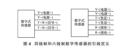 (四根信號(hào)線加兩根電源線) 數(shù)字傳感器。 四線制數(shù)字傳感器和六線制數(shù)字傳感器的引線定義如圖4所示。
