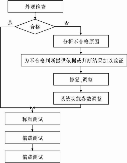 地磅經(jīng)過一段時(shí)間的使用,出現(xiàn)偏差是正常的。引發(fā)汽車衡偏載超差的原因有多種,有時(shí)甚至幾個(gè)原因同時(shí)出現(xiàn)。在現(xiàn)場(chǎng)調(diào)試時(shí),一般應(yīng)遵循以下步驟,采用多種方法分析超差原因,利用角差公式詳細(xì)排查調(diào)試環(huán)節(jié),偏差即可解決,附調(diào)試步驟圖(見圖3)。
