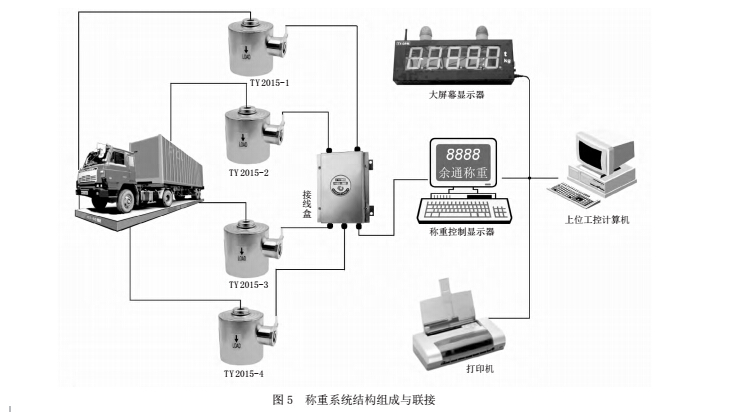 (二) 稱重系統(tǒng)主要功能:汽車衡稱重系統(tǒng)主體結構與聯接如圖 5 所示。由承重秤體、稱重傳感器(4 組)、稱重信號接線盒、稱重顯示控制器、大屏顯示器、打印機等組成,稱重數字信號可上傳到上位工控計算機。