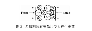 如圖3所示,當X切割的石英晶體片沿X軸方 向受一外力作用時,內部產生極化,在垂直于X軸 的兩個平面上產生等量的正負電荷;當X切割的石 英晶體片沿Y軸或Z軸受一外力作用時,則不會在 垂直于X軸的兩個平面上產生電荷;這種現象被稱 為縱向壓電效應。