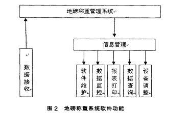 系統(tǒng)軟件是整個系統(tǒng)的核心。軟件采角基于 WINDOWS XP操作系統(tǒng)的地鎊稱重系統(tǒng)管理軟 件。該軟件主要分為兩個功能塊:一個功能塊是數(shù) 據(jù)發(fā)送端軟件接收管理,主要處理稱量數(shù)據(jù)的信息 采集和發(fā)送,將計量數(shù)據(jù)從儀表接收端發(fā)送到計算 機數(shù)據(jù)接收端自動將數(shù)據(jù)存儲在電腦上,并在稱量 軟件上實時顯示數(shù)據(jù);另一個主要功能塊是完成數(shù) 據(jù)的接收形成數(shù)據(jù)的信息管理,包括軟件維護、數(shù) 據(jù)監(jiān)控、報表統(tǒng)計、資料打印、數(shù)據(jù)查詢和現(xiàn)場計量 設(shè)備的跟蹤調(diào)整。軟件功能示意如圖2所示。