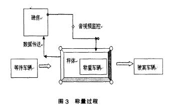 地磅計量系統(tǒng)安裝在酒鋼的可回收資源利 用場地內(nèi),衡器最大可承重200t,安裝在距值班室 東側(cè)50m處項目的稱量軟件上實時顯示數(shù)據(jù)。通過 視頻監(jiān)控,音頻視頻實時傳輸技術(shù)對計量過程全程 監(jiān)督利用網(wǎng)絡(luò)技術(shù)實現(xiàn)了計量稱重數(shù)據(jù)自動上傳。 當載重汽車稱量時首先告知磅房值班員,并取得相 關(guān)票據(jù),安裝在現(xiàn)場值班室前端的攝像機及安裝在 秤體兩端的紅外光電傳感器開始工作,此時值班員 需觀察視頻監(jiān)控主機和磅房稱量系統(tǒng)界面,當載重 汽車確實完全進人衡器且前后紅外報警裝置均不 被遮擋,待衡器達到穩(wěn)定狀態(tài)后,即計量數(shù)據(jù)不隨 車輛慣性發(fā)生浮動后數(shù)據(jù)自動存人磅房稱重系統(tǒng)。 當車輛處于非正常位置時,值班員可在磅房內(nèi)通過 圖像和光電傳感器進行識別,用話筒和設(shè)在現(xiàn)場的 揚聲器提醒駕駛員及時調(diào)整車輛位置,直到數(shù)據(jù)自 動上傳為止。稱重過程如圖3所示。