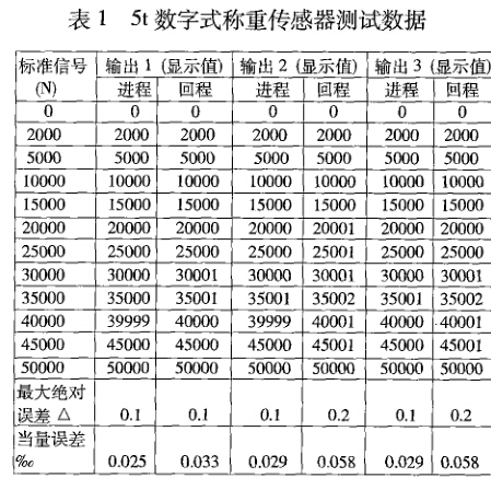 為了檢驗(yàn)數(shù)字式稱重傳感器的準(zhǔn)確度,參照 G&T7724-1999的檢測(cè)方法,用標(biāo)準(zhǔn)測(cè)力機(jī)進(jìn)行試 驗(yàn),結(jié)果見(jiàn)表1。